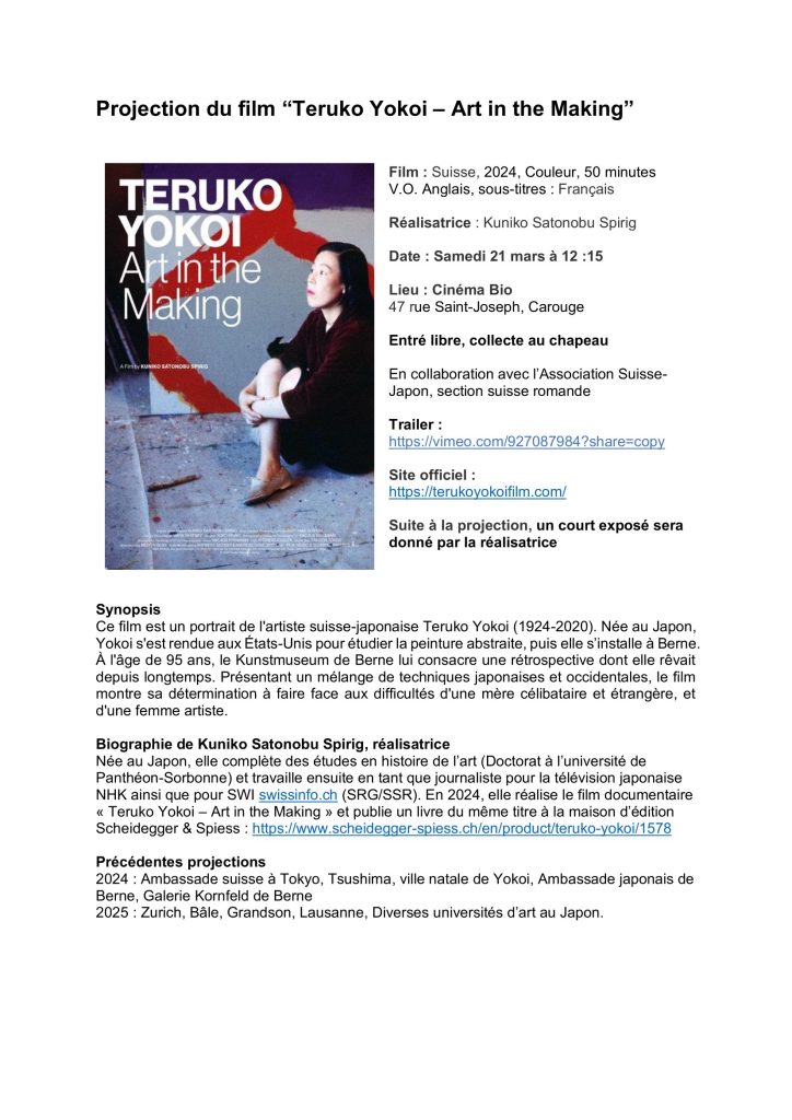 Nous avons le plaisir de vous informer que notre chère membre, Kuniko Satonobu Spirig, invite les membres du Cercle à assister à une projection gratuite du film « Teruko Yokoi – Art in the Making » (voir le flyer en pièce jointe).